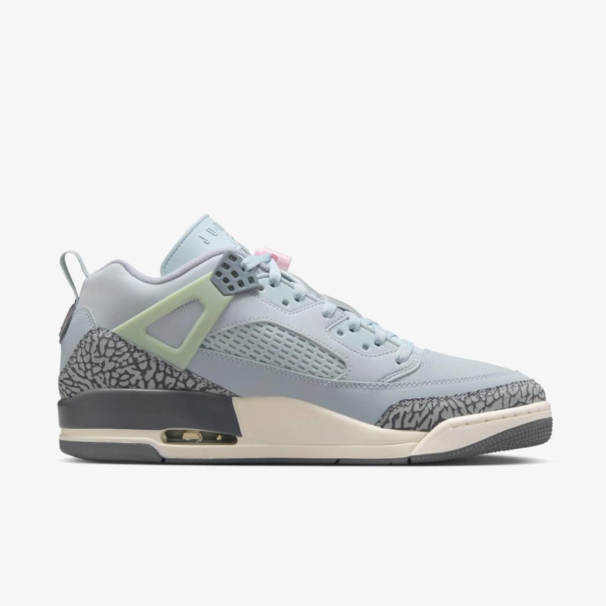 Чоловічі кросівки Jordan Spizike Low «Aura» — унікальний гібридний силует, що поєднує дизайнерські елементи п'яти класичних моделей Air Jordan. Кольорове рішення: Aura (пастельно-блакитний), весна 2026.Технологія Nike Air — подвійна повітряна амортизація (у передній частині та п'ятці), успадкована від класичних моделей Air Jordan 3, 4 та 6.Верхня частина з натуральної та синтетичної шкіри у поєднанні з текстилем — міцна конструкція з елементами Air Jordan 3, 4, 5 та 6.Гібридний низький силует, що поєднує характерні ознаки AJ3 , AJ4 , AJ5, AJ6 та AJ20.Гумова зовнішня підошва з цільним малюнком забезпечує зносостійкість та зчеплення з поверхнею.Логотип Jumpman на язичку. Нашивка «40 Acres» Спайка Лі на п'ятці — данина співпраці між режисером та Jordan Brand.