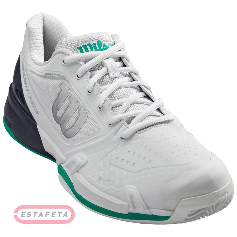 Мужские кроссовки для тенниса Wilson RUSH PRO 2.5 2019 CLAY COURT WH/EBONY/GR SS19 оснащены целым набором технологий. Верх модели SENSIFEEL, гибкий и воздухопроницаемый, гарантирует превосходную адаптивную посадку. Технология SENSITIVE 3D FOREFOOT SUPPORT – адаптивная конструкция поддержки стопы, которая расширяется и сжимается в ответ на движения стопы спортсмена, дает непревзойденное чувство поверхности, динамичный комфорт и контроль движений. Технология 3D-F.s представлена термополиуретановыми вставками в средней части стопы для дополнительной балансировки и реактивности движений. Данная технология с удвоенной силой возвращает игроку энергию, который тот тратит на ловкие движения. Более того, технология способствует устойчивости изделия. Внутренняя стелька по технологии 3D HIGH DENSITY Ortholite SOCKLINER дополняет амортизацию и чувство комфорта. Технология Pro Torque Chassis, которая делает кроссовки устойчивыми, что позволяет спортсмену уверенно двигаться по теннисному корту. Промежуточная подошва DYNAMIC FIT – DF2 предусматривает специальный перепад высоты 9 мм для оптимального реагирования, эффективной энергоотдачи и невесомой амортизации. Технология 3D ARCH SUPPORT ™ также способствует ловкости игрока, давая возможность ему контролировать свои передвижения. Новая подошва Clay Court, разработанная специально для игры на кортах с грунтовым покрытием, обеспечивает необходимое сцепление с поверхностью во время движений в различных направлениях. Износостойкий гибкий протектор из DURALAST с особым зигзагообразным рисунком делает кроссовки устойчивыми к истиранию и гарантирует надежное сцепление с поверхностью корта. Классическая шнуровка отлично фиксирует посадку. Усиление задника и носка продлевает срок службы обуви и защищает стопу от травмирования. Лого Wilson на боковых сторонах кроссовка.