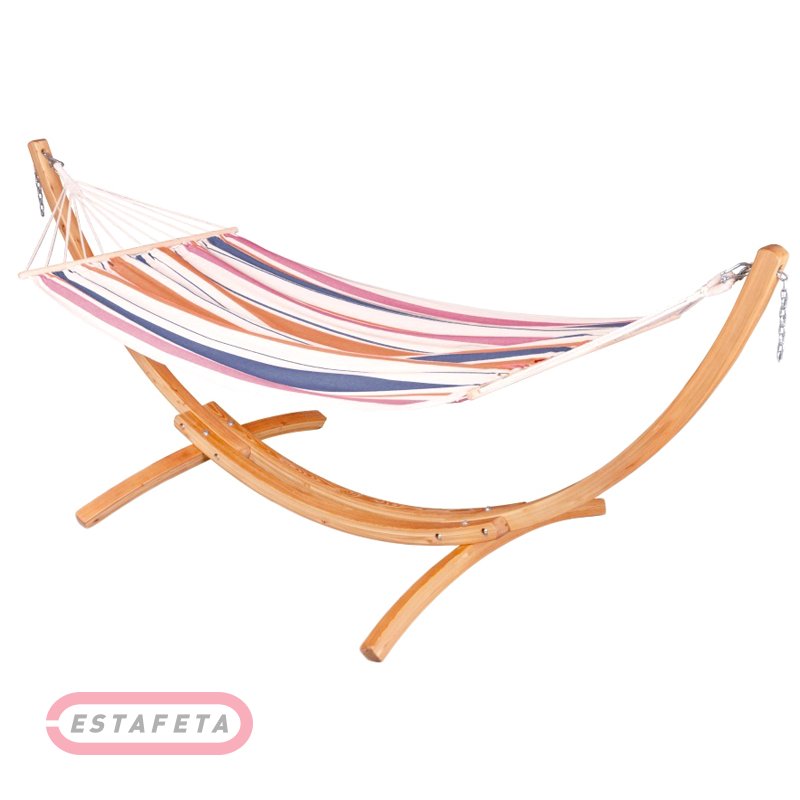 Гамак со стойкой для семейного отдыха, пикника, для использования на даче. Легко складывается, удобный в транспортировке. Выполнен из качественного и прочного хлопка, полиэстера, стойка деревянная. Фиксируется крепежными металлическими цепями. Гарантирована максимальная прочность и устойчивость всего каркаса. Размер: 320х120х120 см, максимальный вес для использования - 120 кг, вес изделия - 25.3 кг.