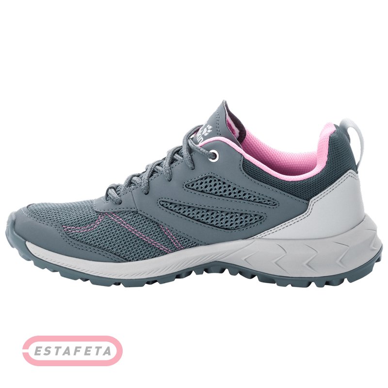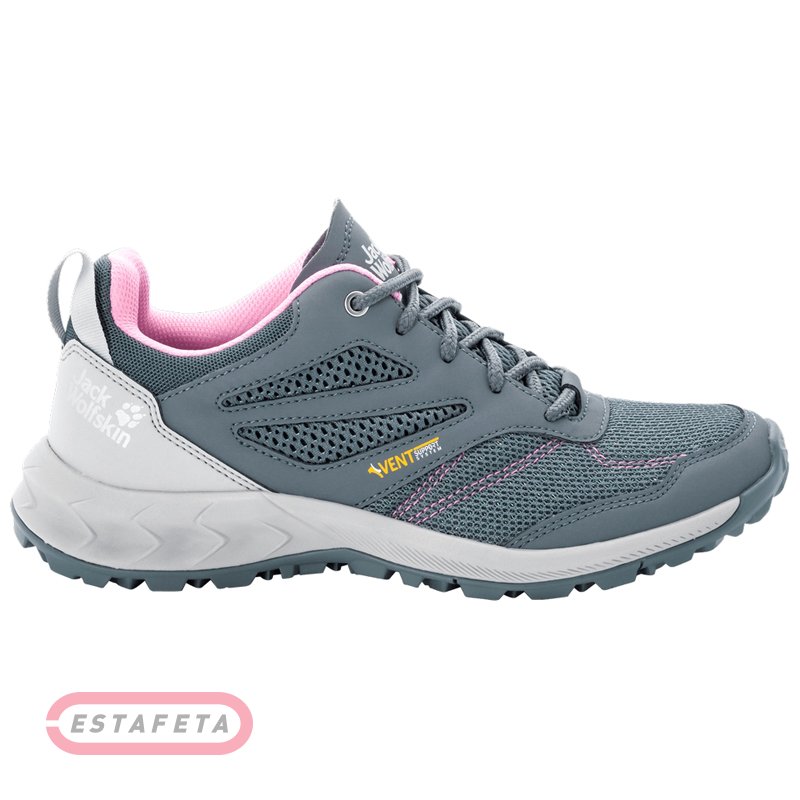 Кроссовки Jack Wolfskin WOODLAND VENT LOW W для летнего хайкинга и энергичных путешествий, невероятно легкие и превосходно вентилируемые благодаря верху из сетчатого материала. Технология VENT SUPPORT SYSTEM - это система вентиляции, которая улучшает климатический комфорт, используя постоянную циркуляцию воздуха, обеспечивает оптимальную вентиляцию и быстрый отвод влаги. Анатомические стельки Comfort Fit разработаны специально для того, чтобы вам было максимально комфортно. Обувь имеет мягкую вставку REFLEX FOAM в межподошве для повышения комфорта и уменьшения усилий при ходьбе. Подошва оснащена протектором WOLF GRIP SYSTEM для надежного сцепления в условиях пересеченной местности. Вес: 520 г / пара (размер 4). Брендинг Jack Wolfskin.