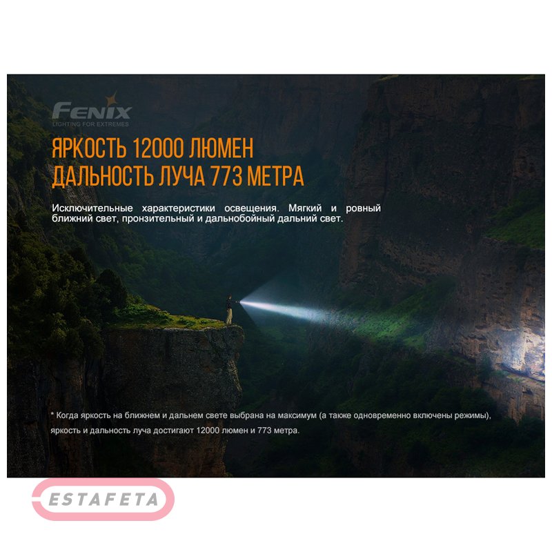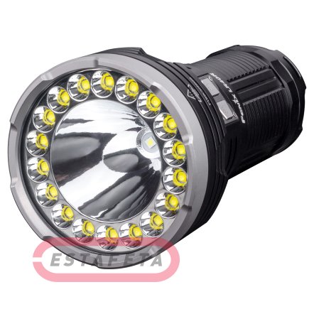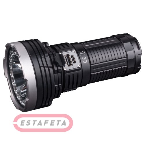 Фонарь Fenix LR40R предназначен для поисковых целей, может применяться в туризме, во время активного отдыха. Его возможности достигают 12 000 люмен по яркости и 773 м по дистанции освещения. Фонарь работает за счет долговечных диодов со сроком службы по 50 000 часов. Он собран из прочных материалов и защищен от всех наиболее распространенных типов неполадок. В том числе, у этой модели полностью водонепроницаемый металлический корпус с защитой от окисления. Фонарь Fenix LR40R работает в 11 разных режимах. Из них 2 приходятся на мигающее сигнальное освещение, 4 – дальний свет и 5 – ближний свет. Режимы ближнего и дальнего освещения можно включать по отдельности или же в комбинации друг с другом. Сигнальные режимы работают независимо или одновременно с дальним освещением. Дальний свет: High: яркость 1000 люмен, интенсивность потока – 101 960 кд, дистанция освещения – 640 м. Со своим аккумулятором фонарь работает в течение 7 часов / Med: яркость 350 люмен, интенсивность потока – 40 105 кд, дистанция освещения – 401 м. Со своим аккумулятором фонарь работает в течение 22 часов 30 минут / Low: яркость 150 люмен, интенсивность потока – 170239 кд, дистанция освещения – 263 м. Со своим аккумулятором фонарь работает в течение 44 часов 31 минуты / Eco: яркость 50 люмен, интенсивность потока – 6608 кд, дистанция освещения – 163 м. Со своим аккумулятором фонарь работает в течение 92 часов 18 минут. Ближний свет: Turbo: яркость 11 000 люмен, интенсивность потока – 41 867 кд, дистанция освещения – 410 м. Со своим аккумулятором фонарь работает в течение 45 минут / High II: яркость 6000 люмен, интенсивность потока – 21 510 кд, дистанция освещения – 295 м. Со своим аккумулятором фонарь работает на протяжении 2 часов / High I: яркость 3000 люмен, интенсивность потока – 9830 кд, дистанция освещения – 200 м. Со своим аккумулятором фонарь работает на протяжении 2 часов 50 минут / Med: яркость 1000 люмен, интенсивность потока – 3142 кд, дистанция освещения – 115 м. Со своим аккумулятором фонарь работает в течение 7 часов 15 минут / Low: яркость 350 люмен, интенсивность потока – 915 кд, дистанция освещения – 65 м. Со своим аккумулятором фонарь работает в течение 22 часов 44 минут. Сигнальные режимы: Strobe: яркость сигнала равна 3000 люмен / SOS: яркость сигнала равна 350 люмен. Все перечисленные режимы управляются двумя кнопками. Одна из них отвечает за включение и установку режимов ближнего света, а также сигнальных режимов, вторая - управляет дальним освещением. Чтобы фонарь не разряжался во время транспортировки, кнопки блокируются. Для этого пользователь должен подержать их нажатыми одновременно в течение 3 секунд. Рядом с кнопками управления размещены лампочки индикатора энергии. Индикатор сработает, если 1 раз нажать на любую кнопку, в то время, когда Fenix LR40R выключен.Если загорятся все 4 лампочки, аккумулятор сейчас заряжен на 100-80%. Когда светиться будут 3 из 4 лампочек, заряда осталось 80%-60%. Сигнал 2 лампочек указывает на заряд 60%-40%. Когда светится 1 лампочка, заряда в аккумуляторе осталось 40%-20%. Если мигает только 1 лампочка. То уровень заряда опустился ниже 20%.Фонарь с его фирменным аккумулятором можно использовать как источник энергии для зарядки других устройств. Сам Fenix LR40R заряжается через порт USB Type-C по протоколу QC3.0, QC2.0. Он также поддерживает подключение адаптера 5В для быстрой зарядки. В процессе зарядки лампочки индикатора будут все время мигать, а фонарь сможет р