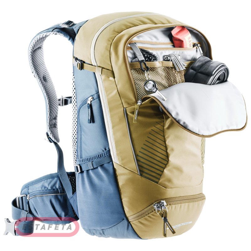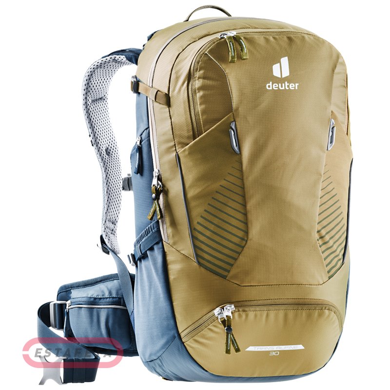 Рюкзак Deuter Trans Alpine 30 6314 clay-marine с обновленной системой спинки DEUTER AIRSTRIPES обеспечивает улучшенную вентиляцию за счет меньшей контактной поверхности и более гибких плечевых ремней для большей свободы движений. DEUTER AIRSTRIPES: двухконтурная конструкция из вспененного материала с воздушным каналом посередине и сетчатым материалом Wide AirMesh в качестве подкладки. Уменьшенная площадь контакта со спиной создает лучшую вентиляцию, а вес рюкзака расположен максимально близко к телу, что способствует превосходной устойчивости пользователя. Эргономичные плечевые лямки со сглаженными мягкими краями. Регулируемая грудная стяжка. Поясной ремень с карманами на молнии обеспечивает ровную и стабильную посадку на теле. Держатель шлема, с которым легко и быстро обращаться, и отсек для насоса, к которому легко получить доступ снаружи, являются совершенно новыми. Рюкзак совместим с питьевой системой. Дополнительный доступ на молнии в основное отделение снизу. Внутренняя перегородка на молнии позволяет разделить основное отделение на два. Надежный боковой карман на молнии. Эластичные боковые карманы и карман с фронтальной стороны. Большой передний карман на молнии с органайзером и карабином для ключей. Боковые компрессионные ремни для стяжки груза. Накидка от дождя с петлей для сигнального фонарика. Съемная сидушка в спинке. Отделение для велоинструментов. Петля на лямке для фиксации очков. Рюкзак изготовлен из комбинации прочных и износостойких материалов полиамид 210D PA / полиэстер 600D. Плотный материал полиамид 210D PA является идеальным сочетанием высокой прочности и малого веса, высококачественное полиуретановое покрытие для защиты от влаги и грязи. 600D PES – прочный и износостойкий полиэстер высокой плотности. Светоотражающие элементы со всех сторон. Объем: 30 л. Размеры: 54 x 28 x 24 см. Вес: 1,23 кг. Брендинг Deuter .