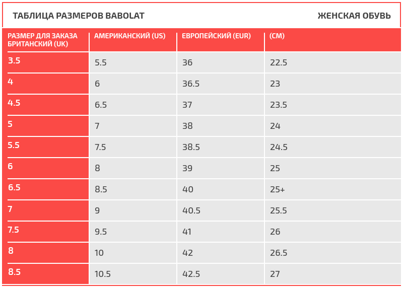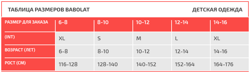 Таблица размеров Babolat
