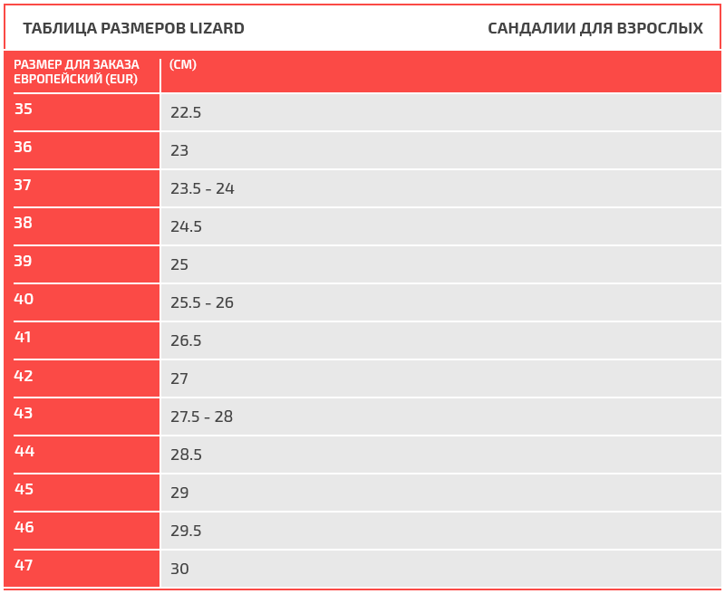 Таблица размеров Lizard