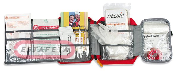 Аптечка TATONKA First Aid Compact red – це базовий комплект для надання першої допомоги одному або двом людям. Підходить для одноденної, максимум триденної поїздки в місця, де відсутні медпункти. Переноситься за допомогою короткої ручки. Аптечка повністю розкривається, для того, щоб ви швидко змогли знайти необхідний препарат. У набір входить: дві стерильні пов'язки для ран 10 x 6 см; один бактерицидний лейкопластир Hansaplast 20 x 6 см; один не прилипаючий до рани компрес SAN 10 x 10 см; десять спиртових тампонів; одна інструкція з надання невідкладної першої допомоги; контрольний список; ножиці; пінцет; рятувальне покривало; дві пари вінілових рукавичок; один великий перев'язний пакет з неприлипаючим до рани компресом; лейкопластир Leukoplast® у рулоні 5 м x 1,25 см; трикутна пов'язка (віскозна).