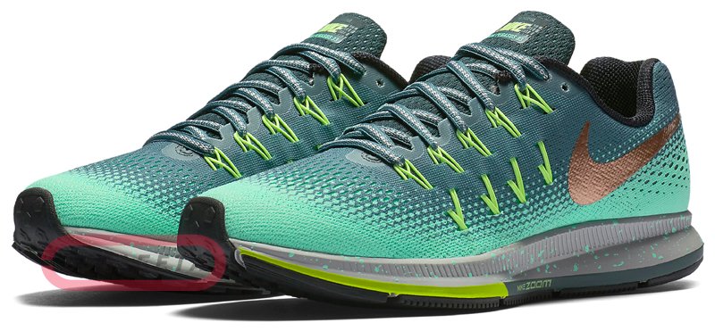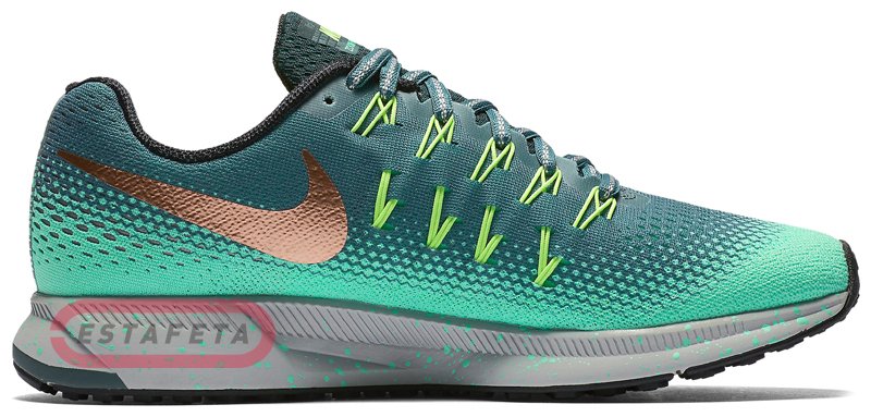 Женские кроссовки для бега Nike W AIR ZOOM PEGASUS 33 SHIELD - обновленная версия легендарной линейки беговых кроссовок NIKE AIR ZOOM PEGASUS, сочетающая в себе свойства комфортного и стабильного прототипа с технологическими усовершенствованиями – модель адаптирована к повышенной влажности и низким температурам холодного сезона, а протектор оптимизирован для мокрой дороги и слякоти. Верх модели имеет обработку по технологии DWR (durable water repellent) и защищает ноги спортсмена от сырости за счет сочетания водонепроницаемых свойств покрытия и холода за счет утепляющего внутреннего слоя. В модели также оптимизирована амортизация и сцепление с поверхностью. Прочная структура материала верха обеспечивает прекрасную поддержку стопы и максимальный воздухообмен. Применена технология Dynamic Flywire, которая позволяет индивидуально отрегулировать посадку обуви, обеспечивая идеальную зональную поддержку стопы. Внутренняя поверхность кроссовка выполнена из теплосберегающего текстиля, который дополняет чувство комфорта и удобной посадки кроссовка. Усиленный задник отвечает за поддержку и надежную фиксацию пятки. Подошва выполнена из пеноматериала Cushlon, значительно снижающего вес кроссовка, и обеспечивающего мягкую амортизацию. Блок Nike Zoom Air гарантирует отзывчивую высокоскоростную амортизацию. Прочный износостойкий протектор разбит на секции с различным рисунком, такое сочетание позволяет добиться максимального сцепления с поверхностью. Светоотражающие элементы улучшают видимость в условиях низкой освещенности. Идеальны для спортсменов с нейтральной (нормальной) пронацией свода стопы.