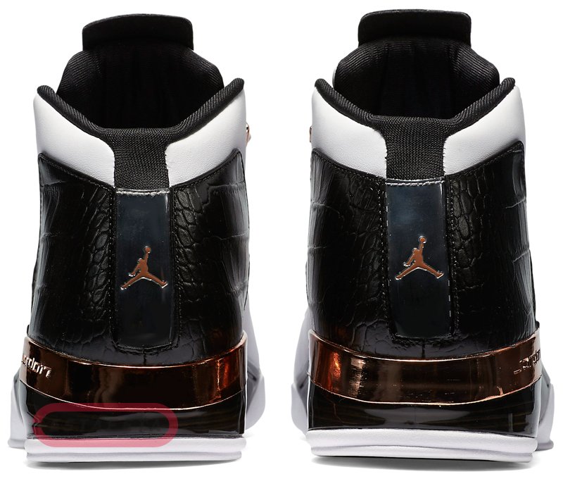 Модель NIKE AIR JORDAN 17 + RETRO действительно выглядит роскошно – сочетание белой премиум кожи и черной лакированной кожи крокодила довершают изысканные полированные медные акценты отделки.