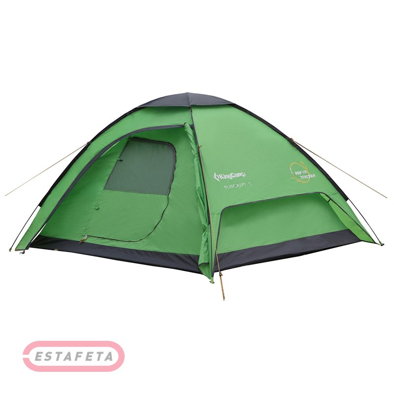 Палатка KingCamp TUSCANY 3 имеет компактные размеры в форме полусферы. Не смотря на небольшие габариты, палатка очень вместительная. продумана для комфортного кемпинга или отдыха за городом. Палатка простая и удобная, комфортная и надежная, является идеальным вариантом для отдыха семьей на природе или походов. Палатка совсем немного весит, поэтому не отяготит вас в дороге. Пол имеет полиуретановое покрытие, что делает его не только легко очищаемым, а и устойчивым к влаге. В палатку вместится до 3 человек. Для транспортировки предусмотрен специальный чехол. Небольшое окошко обеспечивает эффективную вентиляцию, а большой вход – быстрый доступ в палатку.