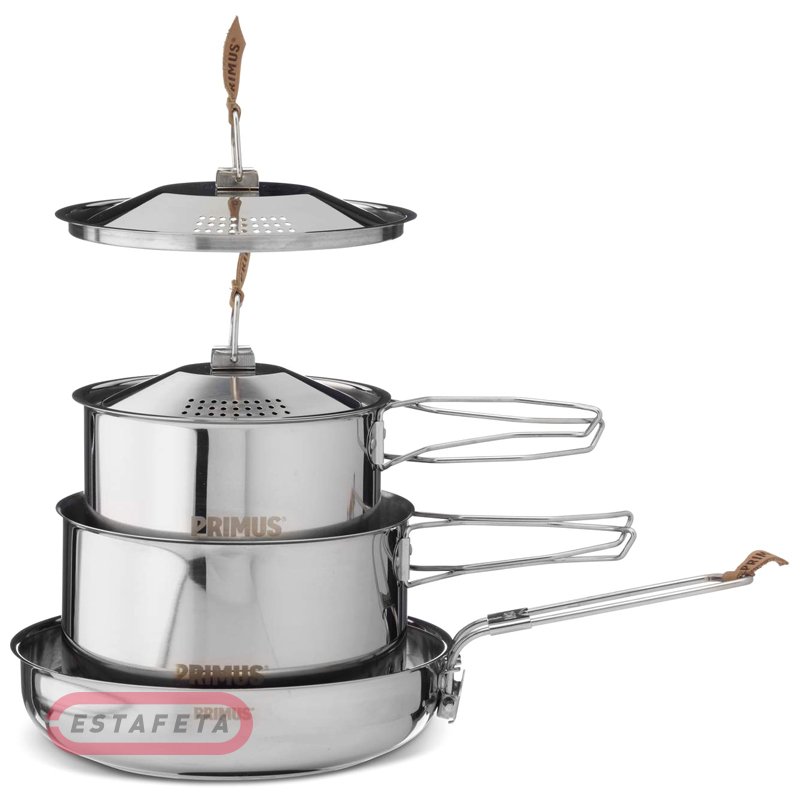 Міцний набір посуду CampFire Cookset S/S про шведської фірми Primus з нержавіючої сталі 18/8 - справжня робоча конячка, розрахована на довгі роки експлуатації. Набір складається із двох казанів (1,8 і 3,0 л), двох кришок із вбудованим друшляком і сковороди із вбудованою ручкою. Великий казан (3,0 літра) має складну ручку й може бути підвішений на відкритому вогні. Також сковорода має складну ручку й алюмінієве дно для рівномірного розподілу тепла. Каструлі й сковорода компактно впаковуються в прикладену сумку для зберігання.