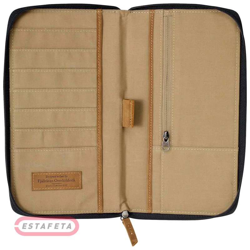 Просторий гаманець FJALLRAVEN Travel Wallet для подорожей - місткий органайзер з міцного матеріалу G-1000 HeavyDuty допомагає зручно скласти документи, паспорт і посадкові квитки. Окремо зберігає банкноти й монети. Застібка-Блискавка. Має кріплення для ручки, щоб завжди бути напоготові. Декорований фірмовим логотипом бренда.