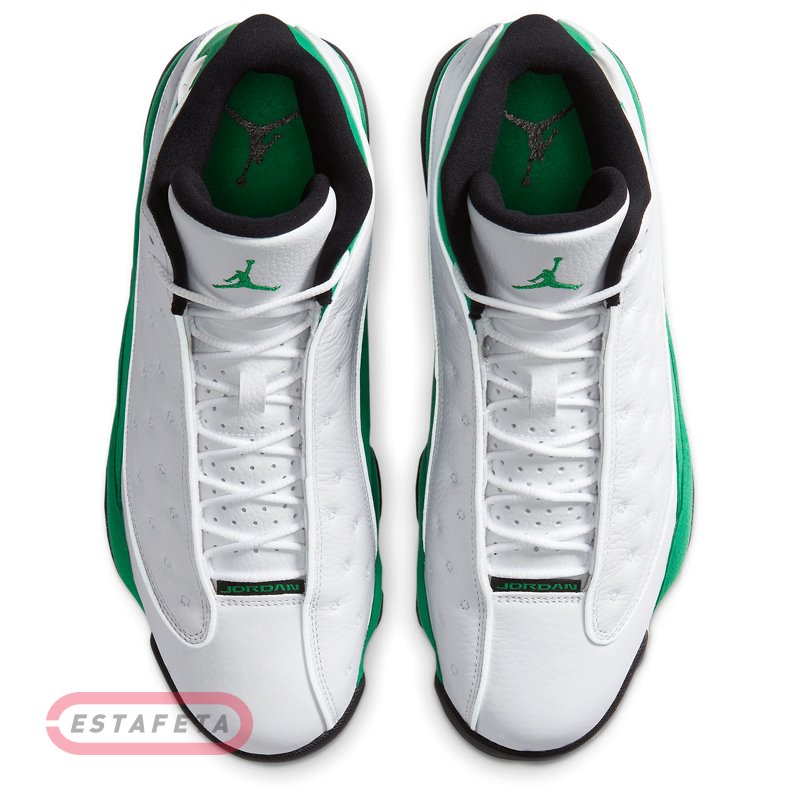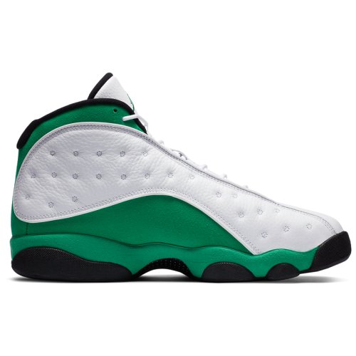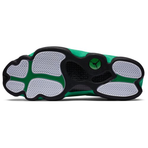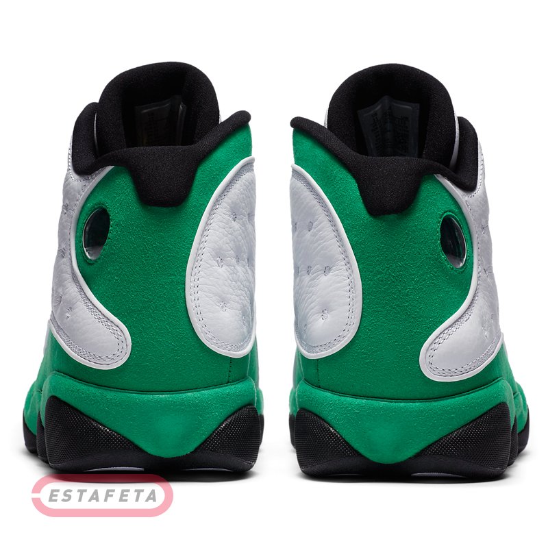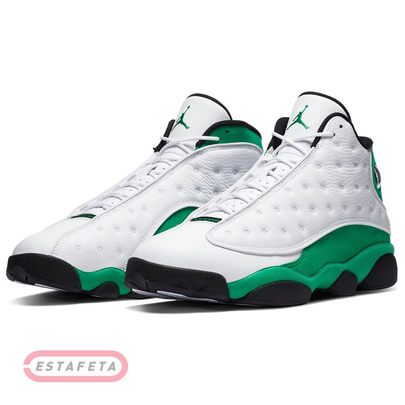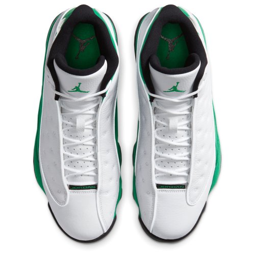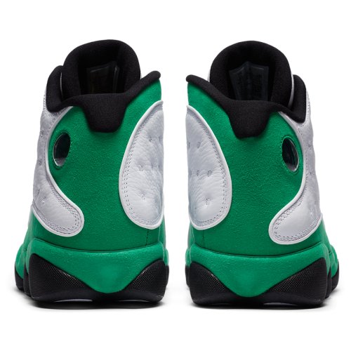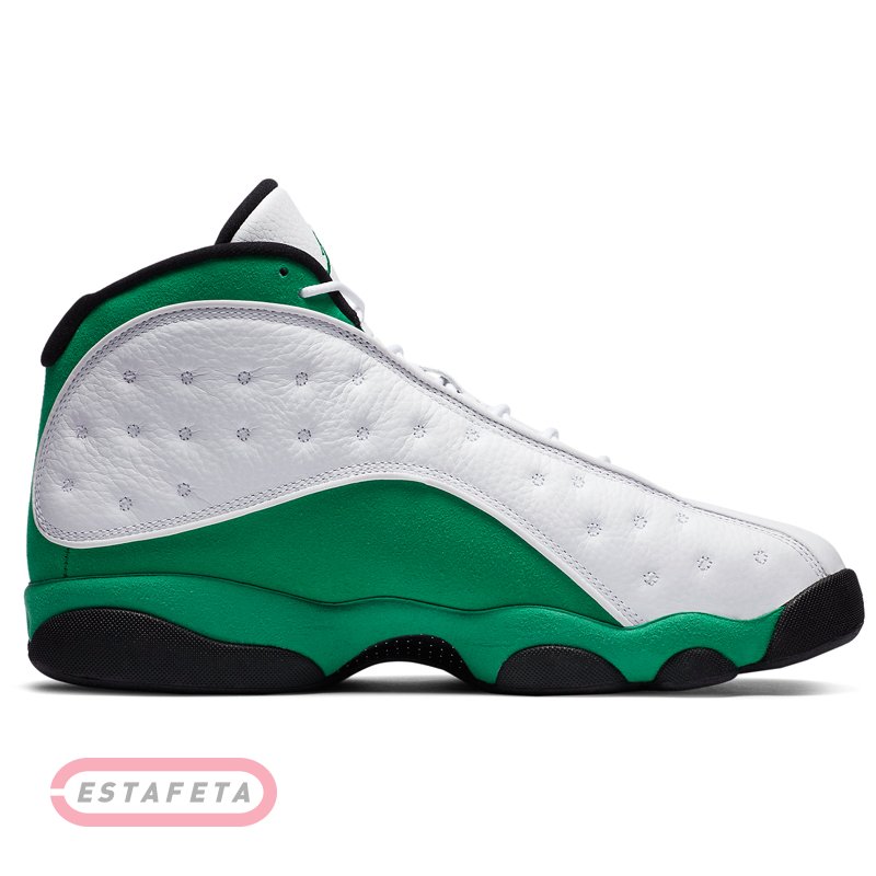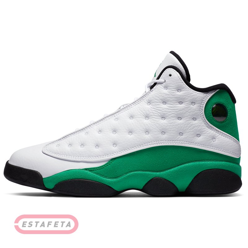 AIR JORDAN 13 носил «Его воздушество» His Airness во время финального сезона с «Chicago Bulls» в 1997-98 годах. Их дизайн был вдохновлен черной пантерой, хищником, сочетающим в себе скорость и скрытность с инстинктом убийцы. Это описание демонстрирует методический подход Майкла Джордана к нападению и его доминирующую игру, недаром прозвище "Black Cat" было дано Майклу другими игроками в лиге. Уникальная подошва кроссовок AIR JORDAN 13 была сформирована, чтобы отдать должное структуре лапы пантеры, в то время, как голографический брендинг напоминает глаз этой черной кошки. Кроссовки NIKE AIR JORDAN 13 RETRO 'Lucky Green'- издание тринадцатой фирменной модели из коллекции Майкла Джордана. Модель имеет белую кожаную основу с зелеными замшевыми накладками, черные детали и светоотражающие вставки 3M окантовки и похожа на Air Jordan 13 Рэя Аллена «Three Point Record» 2011 года. Верх кроссовок выполнен из высококачественной гладкой кожи и гарантирует надежную и удобную посадку. Усиленный задник обеспечивает фиксацию ноги, не сковывая движений. Встроенная специальная уплотняющая вставка в лодыжке для повышенного комфорта и поддержки. Блоки Air-Sole в области пятки и передней части стопы обеспечивают оптимальную отзывчивую амортизацию без утяжеления. Промежуточная подошва модели выполнена из пеноматериала Phylon, эффективно поглощающего ударные нагрузки. Протектор в виде отпечатка звериных лап с шаблоном «елочка» гарантирует высокий уровень тракции, а канавки в протекторе добавляют подошве гибкости.