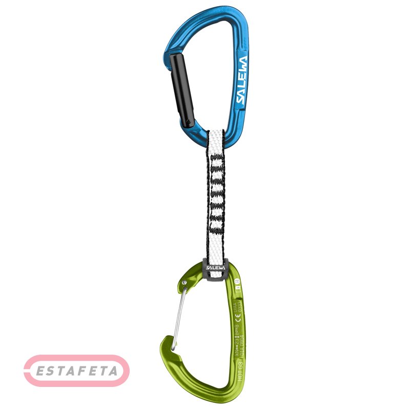 Оттяжка Salewa HOT G3 DYN с двумя карабинами Hot G3 Straight и Hot G3 Bent, стропой Dyneema и протектором, который предотвращает скручивание. Вес: 96 г. Максимальная нагрузка: 22 kN. Размеры: 100 x 16 мм