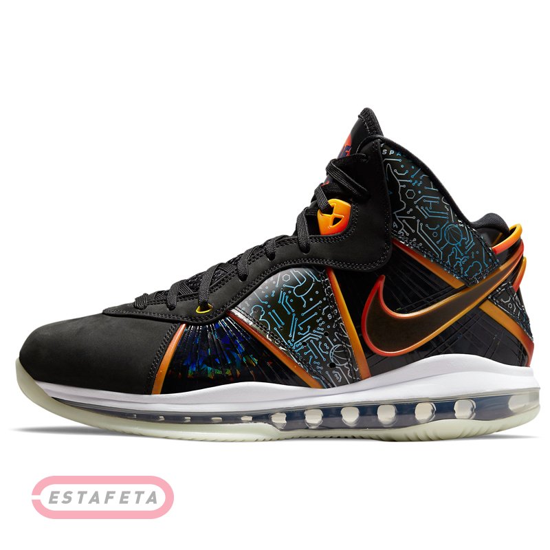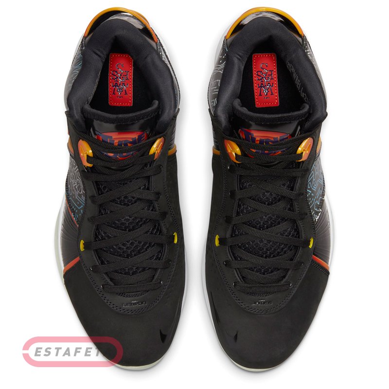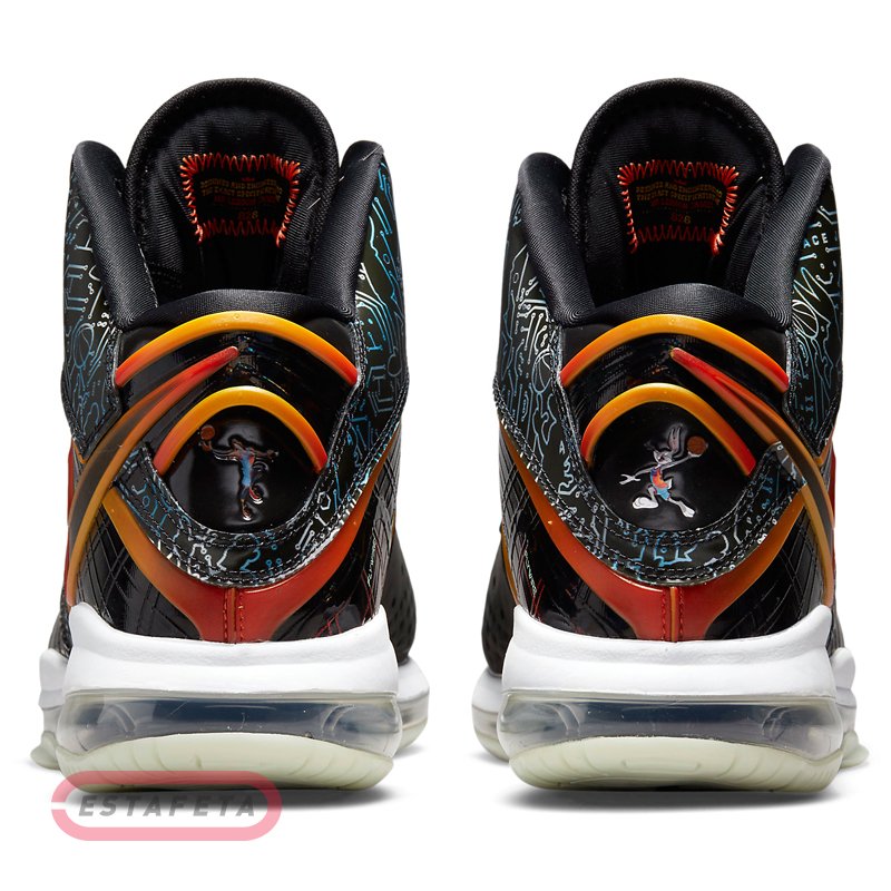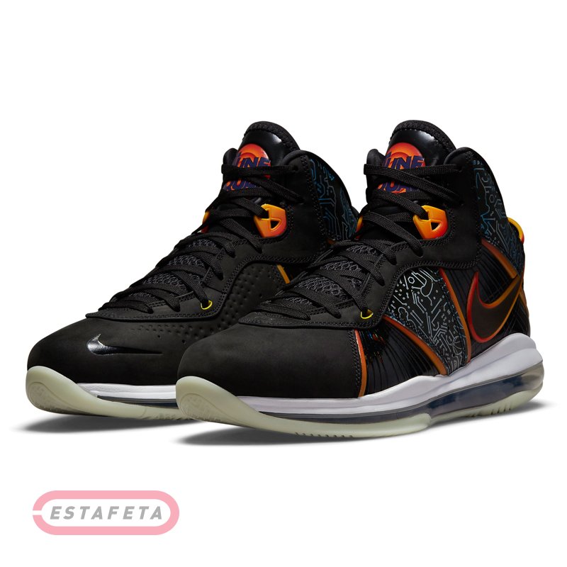 При розробці кросівок дизайнери сполучили вибухонебезпечність, властиву LeBron, максимальний комфорт і супер амортизацію. Коли Леброн прискорюється на майданчику, він генерує гігантську силу. Модель має підошву з комбінованою амортизацією й надає не вичерпується імпульс для прискорення. Вставка Max Air в області п'яти поглинає ударні навантаження. Вставка Zoom Air на всю довжину розташована поруч із вставкою Max Air в області п'яти й доходить до передньої частини стопи. Завдяки збільшеному обсягу вставка забезпечує оптимальне повернення енергії для високої швидкості. Литому задник з матеріалу TPU стабілізує стопу, створюючи імпульс для руху. Легкий і повітропроникається матеріал верху KnitPosite 2.0 добре тягнеться, створюючи щільну посадку. Шнурки просмикуються через особливі отвори в матеріалі для надійної фіксації без обважнення. Вставки Air у язичку забезпечують амортизацію в області верхньої частини стопи. М'який литому бортик для комфорту. Багатобарвна підошва з піноматеріалу повторює дизайн верху для створення єдиного образа й підсилює амортизацію, а устілка забезпечує повітряну м'якість. Гумова підошва з модифікованим протектором забезпечує міцність і зчеплення, необхідні для різких ривків і зміни напрямку руху. LeBron 8 x Space Jam: A New Legacy представляє новий баскетбольний блокбастер - Леброн і його мультяшна команда поборються з лиходіями. Наймогутніший силует із блоком Air Max доповнений логотипом Tune Squad на язичках і фігурками Багза Банні й Леброна на п'ятах, а на верху – принт із елементи друкованої плати, також не обійшлося без фірмового брендингу Леброна.
